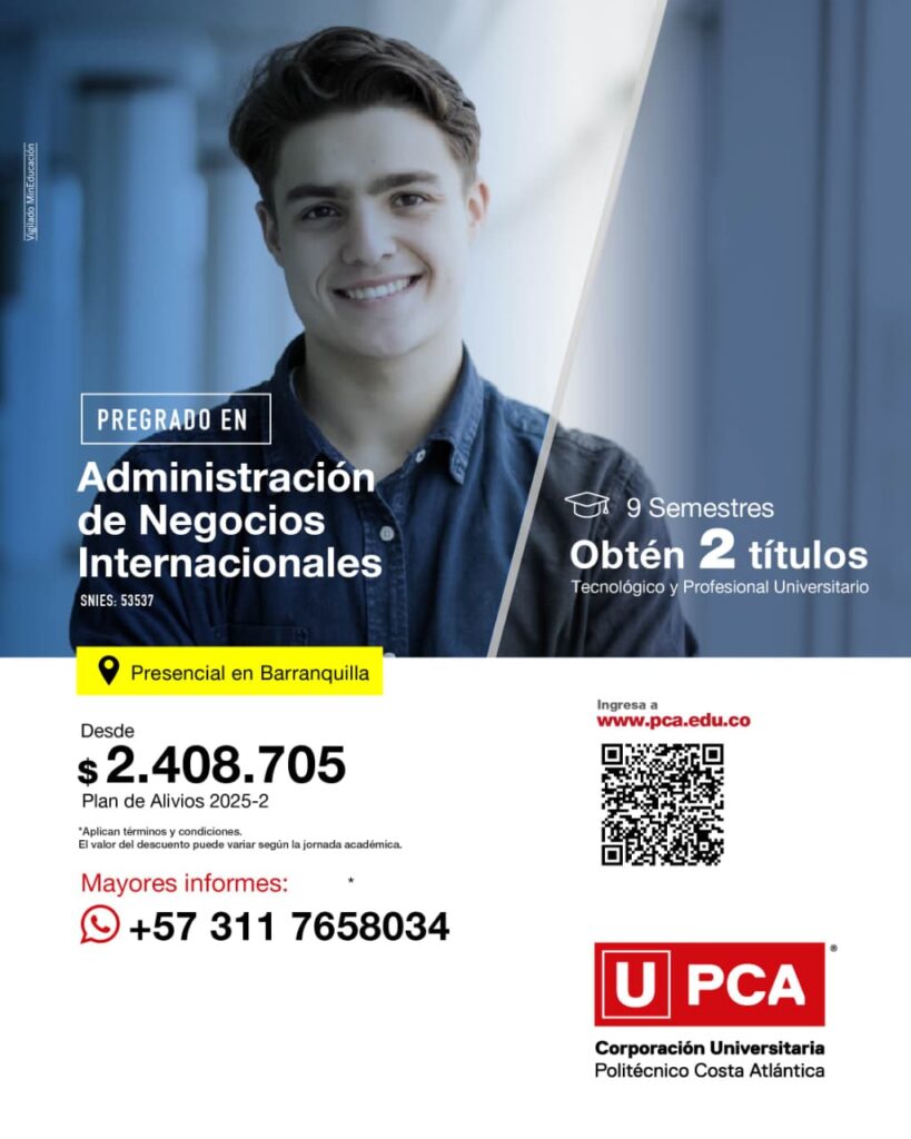 La Corporación Universitaria Politécnico Costa Atlántica (U PCA), destacamos el valor diferencial de nuestro Programa de Administración de Negocios Internacionales, una propuesta académica moderna, dinámica y con enfoque global, diseñada para responder a las exigencias de un mundo empresarial cada vez más interconectado.