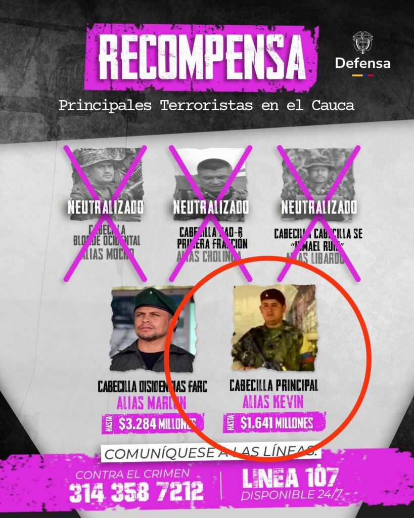 Finalmente, recordó la recompensa que persiste contra otros cabecillas de las disidencias de las FARC como Iván Mordisco o alias Marlon, quienes siguen delinquiendo y causando terror en las comunidades del Cauca, Valle del Cauca, Huila, Guaviare, entre otros.