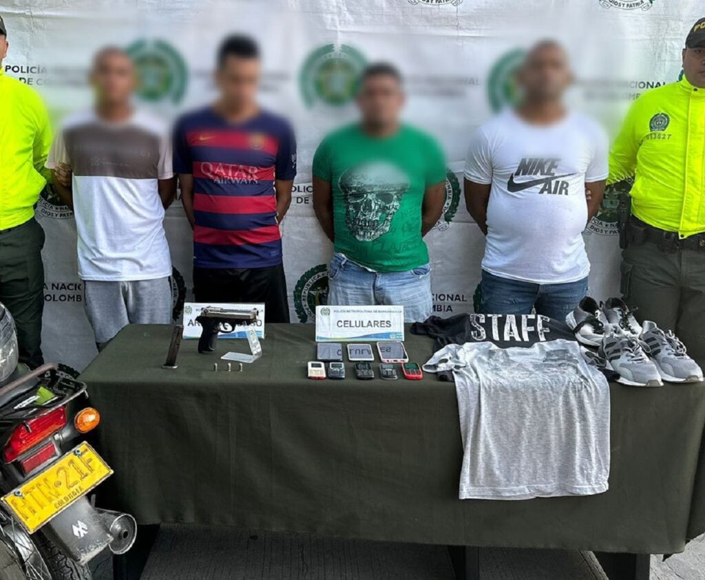 “Fue así como se lograron materializar cuatro diligencias de registro y allanamiento en los barrios San Luis, Santo Domingo y Santa María de Barranquilla, donde se hicieron efectivas las capturas de alias Patepalo, Joche Quijá, Luisito y Caín. En el procedimiento se logró la incautación de un arma de fuego tipo pistola traumática modificada, prendas de vestir y la motocicleta que fue utilizada para cometer la acción delictiva; además, siete celulares”, detalló la Policía Metropolitana de Barranquilla.