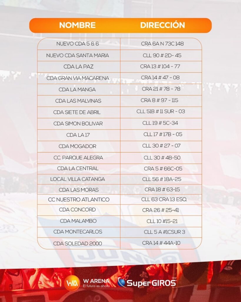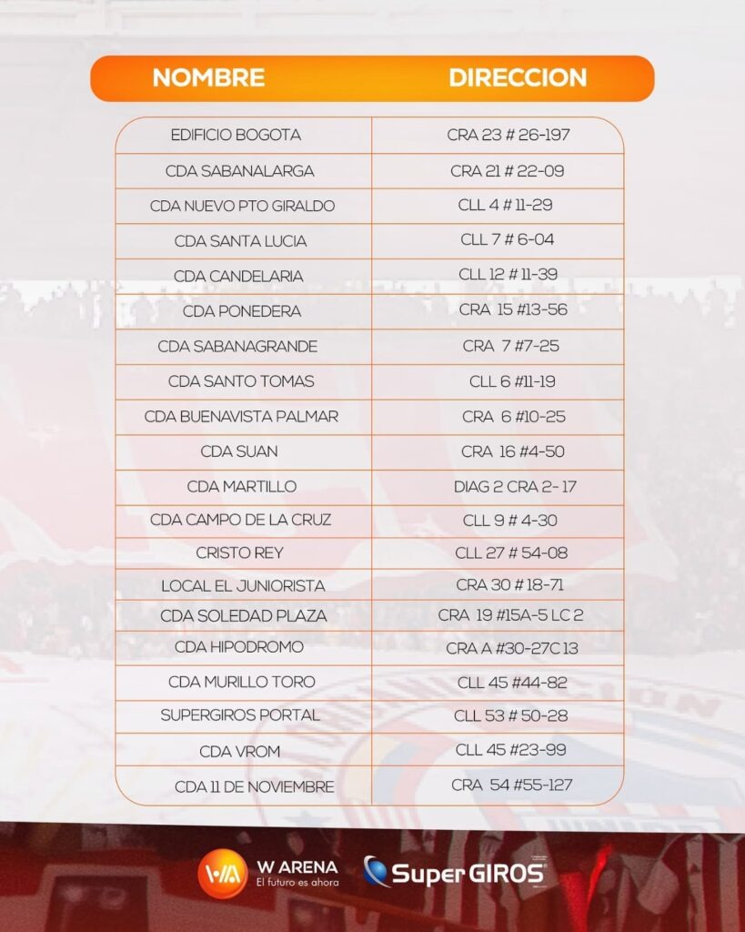 Por eso, uno de los sponsors que se ha unido al Junior de Barranquilla en esta campaña y quien también tiene ese sentir de respaldo al 100 %: la empresa Supergiros, le recuerda a los junioristas que en sus distintos puntos autorizados en Barranquilla y en el Atlántico podrá adquirir los tickets, evitando de esta manera las aglomeraciones y comprándolas de forma rápida, segura y sin complicaciones.