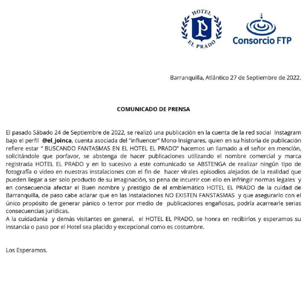 Al hotel no le cayó en gracia que, así fuese mediante una historia de pocos segundos, el hombre, quien cuenta con 11.2 mil seguidores, insinuara que allí hay fantasmas porque esto podría afectar su “buen nombre y prestigio” tal como se lee en un comunicado emitido el 27 de septiembre.