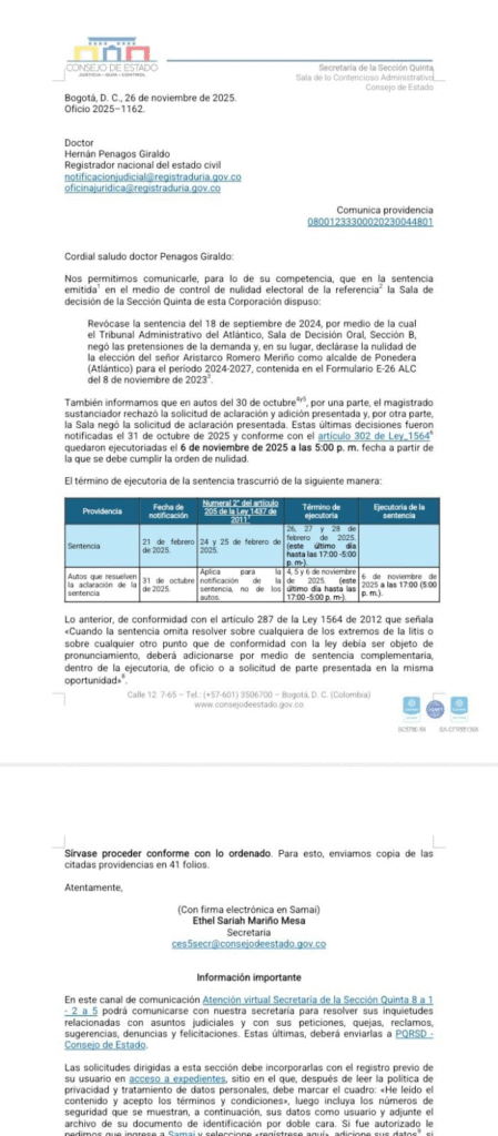 El Consejo de Estado notificó la ejecutoria del fallo que declaró nula la elección de Aristarco Romero como alcalde del municipio de Ponedera, Atlántico. Lo anterior significa que este deja su cargo inmediatamente y deben convocarse nuevas elecciones para elegir a su reemplazo.