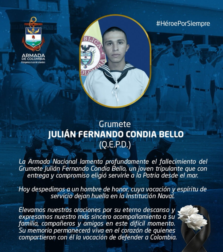 “La Armada Nacional lamenta profundamente el fallecimiento del grumete Julián Fernando Condia Bello, un joven tripulante que con entrega y compromiso eligió servirle a la Patria desde el mar. Hoy despedimos a un hombre de honor“, dijo la Armada en un comunicado.