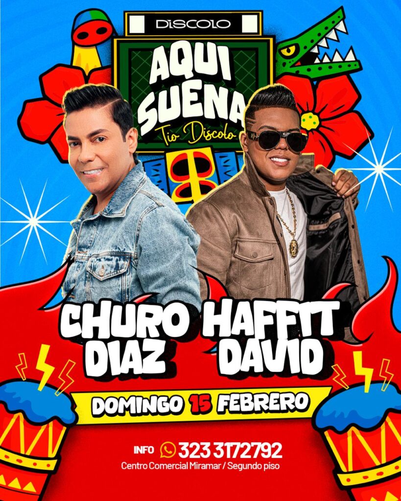 La programación continuará el domingo 15 de febrero con el evento Aquí Suena Tío Díscolo, que contará con las presentaciones de Churo Díaz y Haffit David, dos artistas que llegan con fuerza para poner a cantar al público.