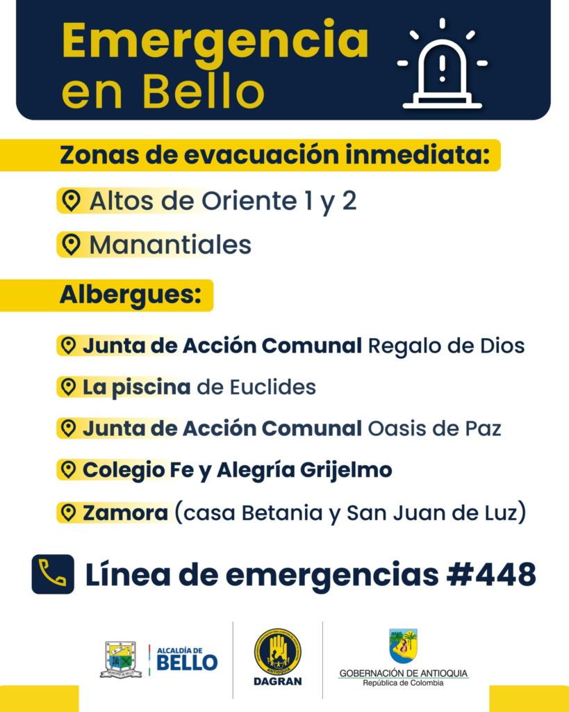 “El riesgo en la vereda Granizal de Bello sigue latente: solicitamos la evacuación inmediata de las viviendas en Altos de Oriente (1 y 2) y Manantiales. La Alcaldía de Bello ha dispuesto albergues con toda la atención humanitaria”, declaró la Gobernación de Antioquia.