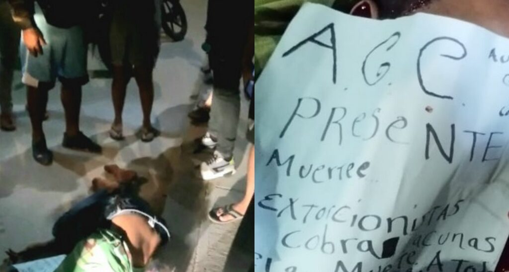 En la noche del lunes Víctor Manuel Uribe Gómez, de 31 años, también fue ultimado a bala. El hombre, que se desempeñaba como conductor de motocarro, quedó tendido al lado de su vehículo y sobre su cuerpo sin vida los homicidas dejaron un aviso bajo la presunta autoría de las AGC ; dicho caso de sangre se registró en la diagonal 65 con carrera 7C, alrededor de las 9:34 p. m.