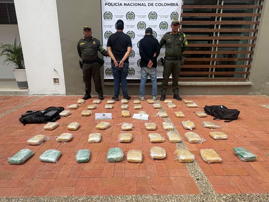 “Momentos en que uniformados de la seccional de Tránsito y Transporte se encontraban realizando operativos de control sobre la vía nacional, a la altura de la báscula, lograron capturar a dos sujetos por el delito de tráfico, fabricación o porte de estupefacientes. Los capturados, fueron identificados como Juan Camilo Giraldo Calderón, de 29 años y Carlos Mario García Rojas, de 30 años, ambos de Cali, quienes viajaban como pasajero en un bus de servicio público que cubría la ruta Medellín – Cartagena”, relató la autoridad.
