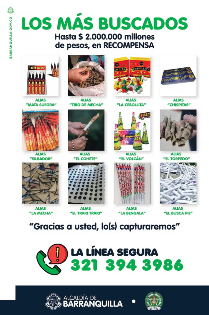 La Policía Metropolitana de Barranquilla sigue socializando el cartel de “los más buscados de la pólvora”. En las últimas horas, fueron incautadas 200 cajas de luces de bengalas.