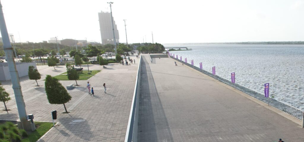 Este lugar, considerado como una de las iniciativas de transformación urbana más emblemáticas de la ciudad, luce esplendoroso adornado por un gran número de banderas de cara al río Magdalena, las cuales dan la bienvenida a los visitantes que harán presencia en este importante foro internacional.