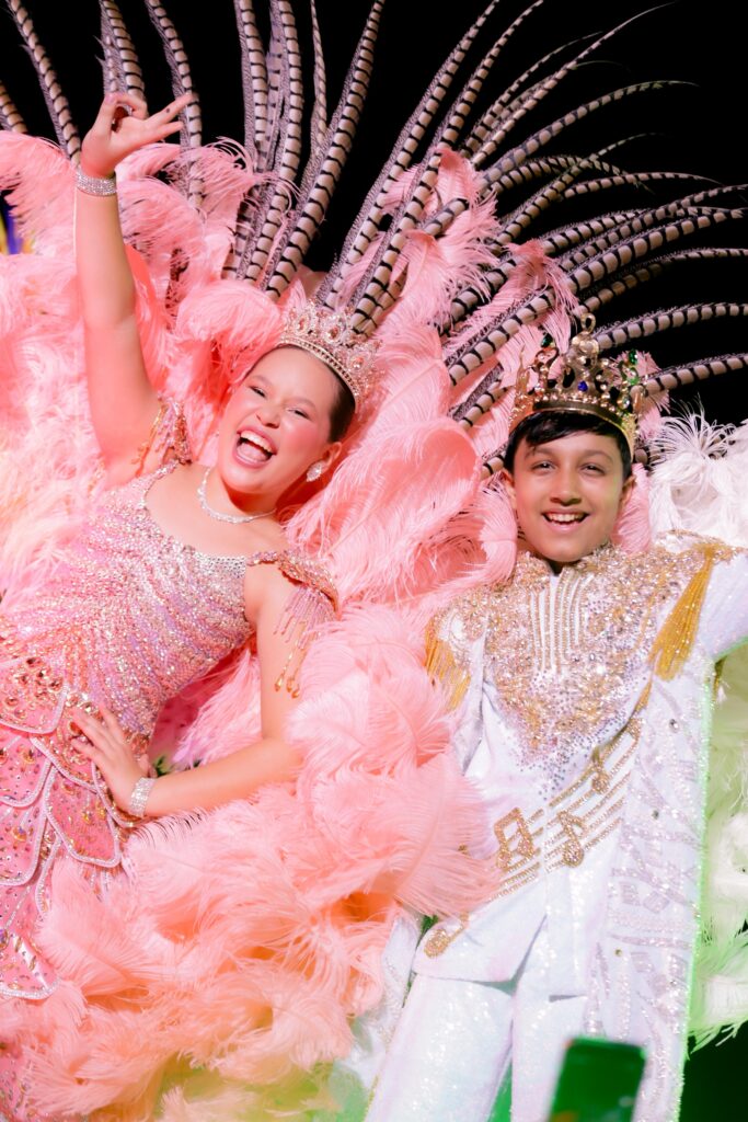 La reina infantil Ashley brilló en el momento de su coronación con “Florecer de alba”, un diseño del creador Jean Robechi. El vestido fue elaborado con pedrería en diversos formatos de color tornasol y strass plateado, complementado con plumas de avestruz y telas nobles como podesuá rígida y mikado en tono palo de rosa.