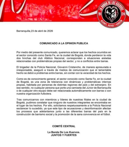 Haciéndole frente a los señalamientos que hizo el comandante de la Policía Metropolitana de Bogotá, general Giovanni Cristancho, la noche del jueves anterior frente a los hechos de violencia que habrían propiciado, supuestamente, ‘barristas’ de Junior de Barranquilla y Atlético Nacional en una zona de tolerancia en la localidad de Santa Fe, desde la capital del Atlántico, la ‘barra’ del conjunto ‘quillero’ identificada como La Banda de Los Kuervos salió a desmentirlo.