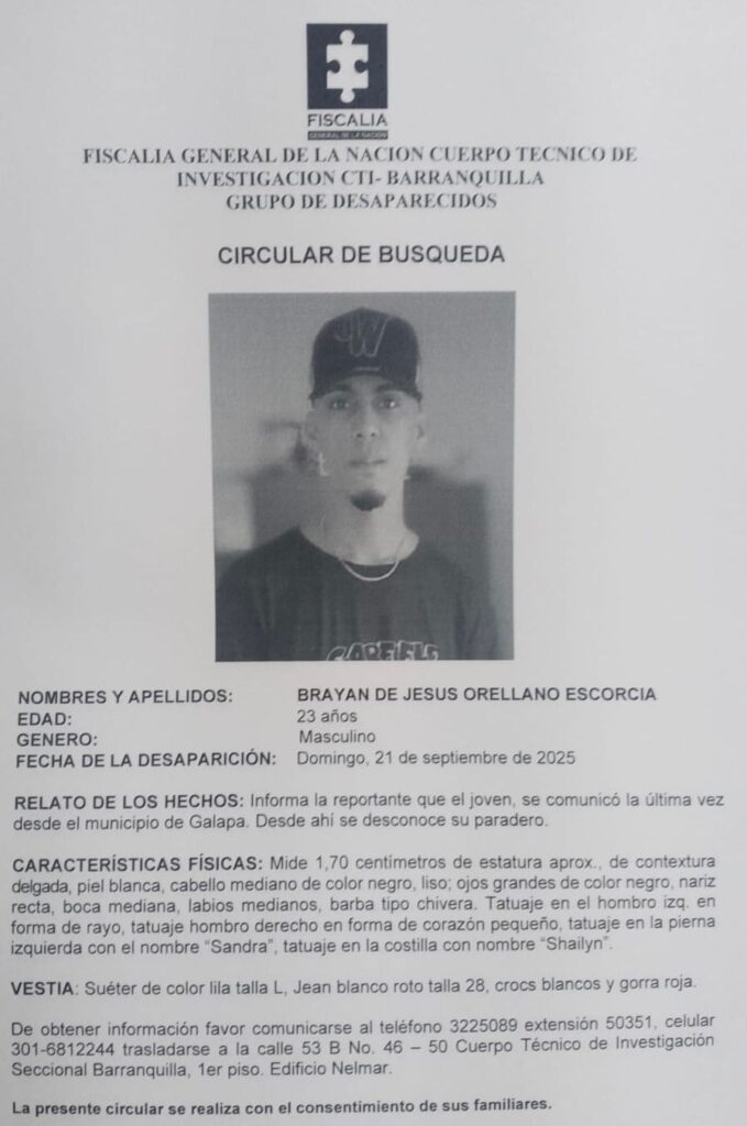 En la circular de búsqueda se lee sobre el hombre: “Mide 170 centímetros de estatura aprox., de contextura delgada, piel blanca, cabello mediano de color negro, liso; ojos grandes de color negro, nariz recta, boca mediana, labios medianos, barba tipo chivera. Tatuaje en el hombro izq. en forma de rayo, tatuaje en el hombro derecho en forma de corazón pequeño, tatuaje en la pierna izquierda con el nombre Sandra, tatuaje en la costilla con nombre Shailyn. Vestía: suéter de color lila talla L, jean blanco roto talla 28, crocs blancos y gorra roja”.