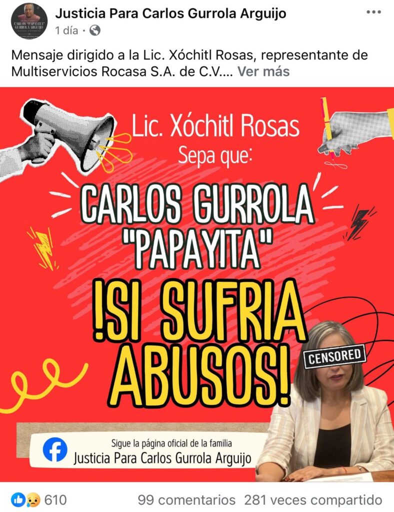 En Facebook fue creada la página Justicia para Carlos Gurrola Arguijo, en la que, tras las declaraciones de Multiservicios, publicaron: