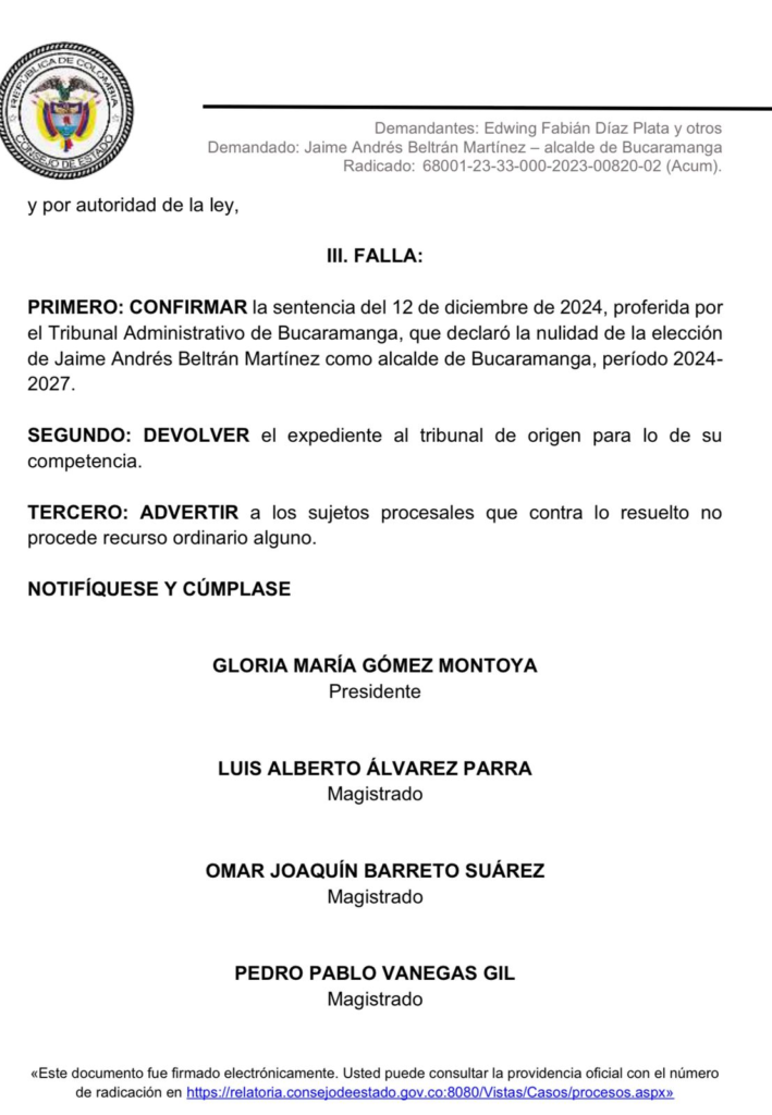 El fallo reafirma la decisión proferida por el Tribunal Administrativo de Santander, que el 12 de diciembre de 2024 declaró nula, en primera instancia, la elección de Jaime Andrés Beltrán Martínez como alcalde de Bucaramanga para el periodo 2024–2027, basándose en la causal de doble militancia política.