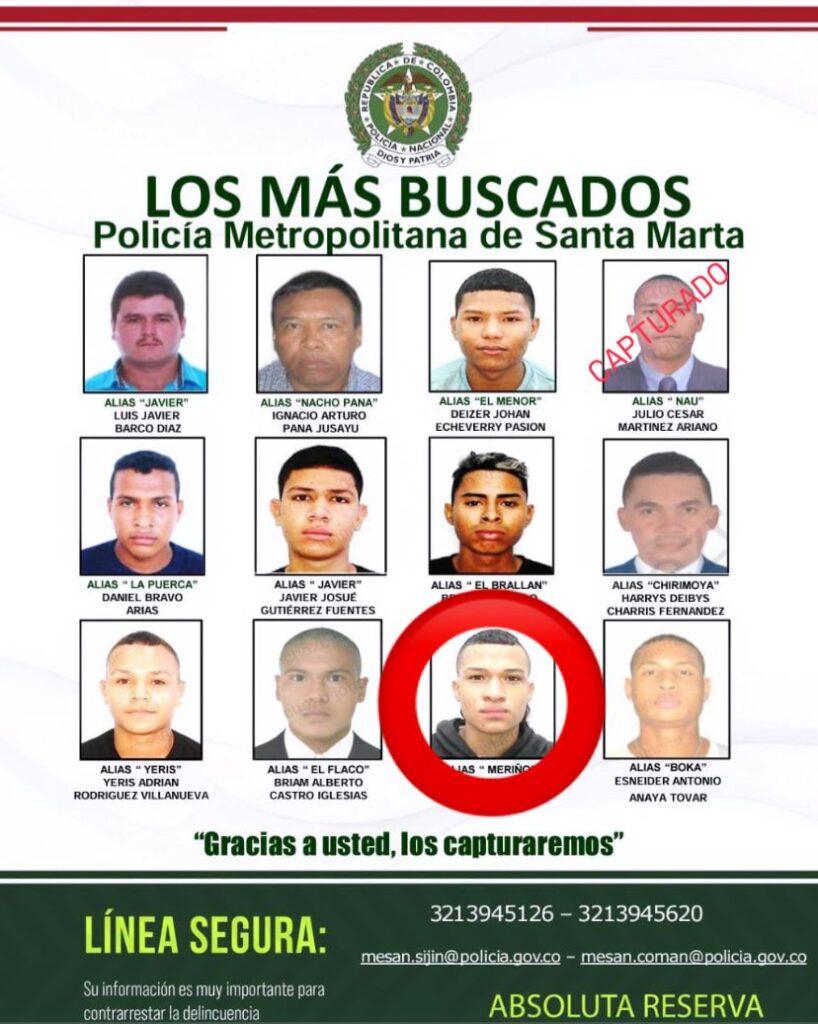 Se trata de alias Meriño, quien, de acuerdo con la autoridad, tras la presión ejercida por la misma, terminó entregándose en la URI de la Fiscalía, ubicada en la calle 21 con carrera 13 del barrio Los Alcázares. Meriño figuraba en el cartel de los más buscados de la Policía Metropolitana de Santa Marta.