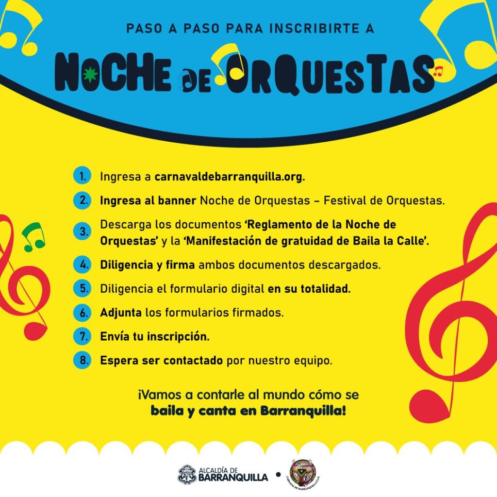 La Noche de Orquestas es una gran vitrina y oportunidad para el talento musical de la ciudad, la región y el país. Los artistas o agrupaciones interesados se podrán inscribir en https://carnavaldebarranquilla.org/, hasta el próximo 15 de febrero.