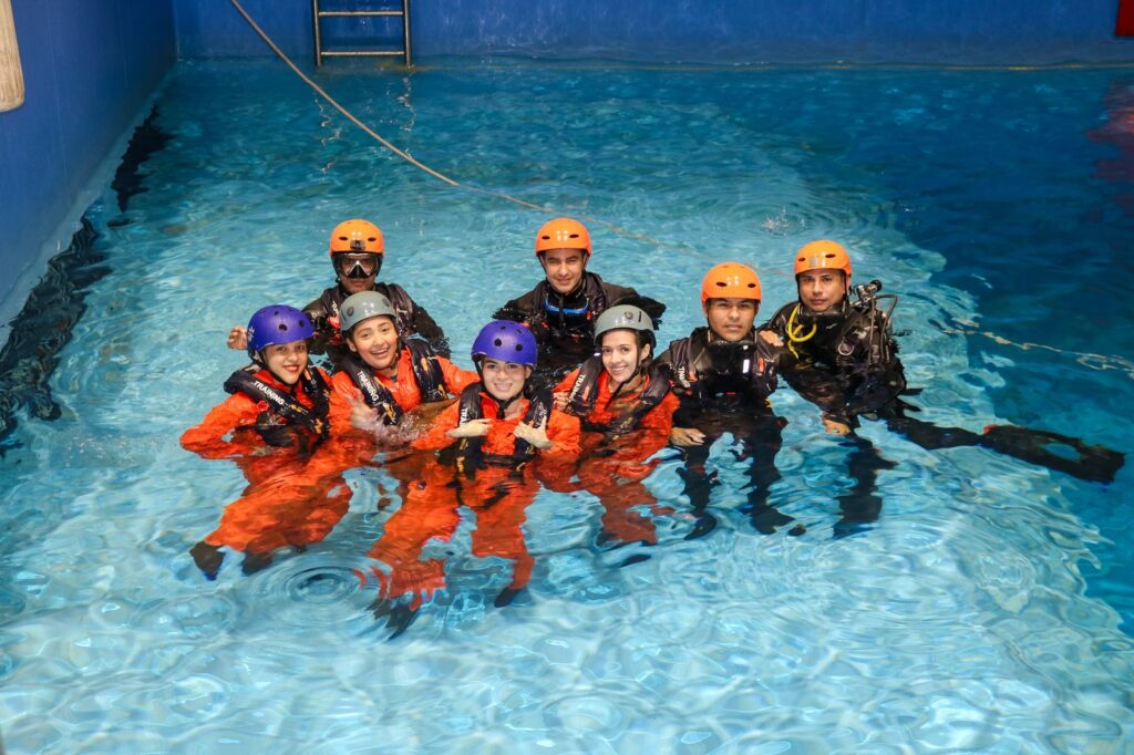 Sumándose a este reto, las representantes de los medios de comunicación realizaron el entrenamiento teórico para, posteriormente, llevar a cabo el salto de confianza desde varios metros de altura a la pileta de entrenamiento y finalizaron con el escape de cabina en ambiente diurno y nocturno en condiciones meteorológicas adversas; durante el entrenamiento, el ejercicio fue supervisado y controlado por el personal de instructores y buzos de la ESCAN.