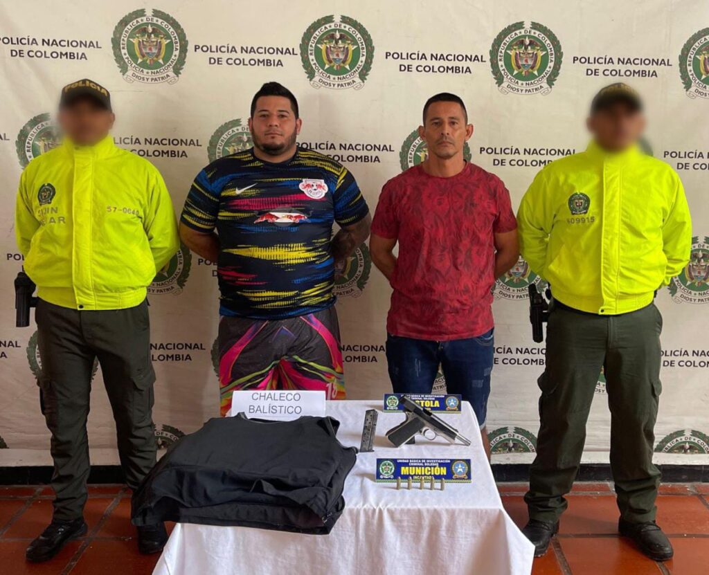 La Policía reveló que las capturas se dieron en los barrios Villa Estadio y Prado del municipio en mención, donde los dos presuntos delincuentes, quienes “serían hombres de confianza en la estructura criminal”, fueron sorprendidos con un arma de fuego tipo pistola calibre 38, un chaleco antibalas y cinco cartuchos calibre 38.
