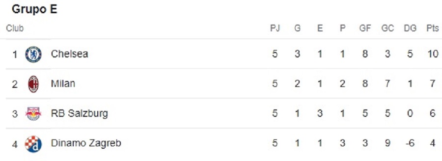 Por el de sector E, en este Chelsea de Inglaterra tiene segura su presencia en la segunda fase del certamen continental, pelándose el cupo dos en este cierre Milan de Italia y RB Salzburgo de Austria, quienes a las 3:00 p. m. se miden en la tierra de la pizza.