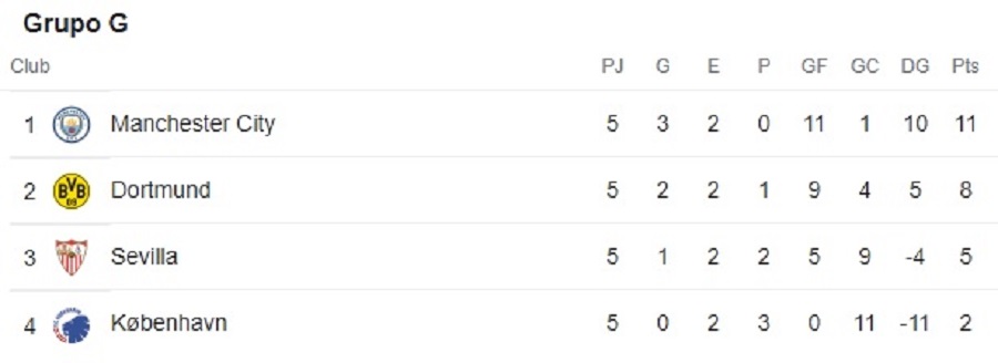 La tarde de hoy (3:00) podría ganar el conjunto sevillano en su visita al City por goleada si desea y el alemán caer por marcador abultado en suelo danés, por lo que Sevilla igualaría al Borussia con 8 puntos. Sin embargo, como el primer ítem de desempate es cómo les fue en el cruce de ambos en esta fase de grupos, Borussia saca ventaja por haberle ganado 4-1 en España y luego empatarle a uno en tierras bávaras.