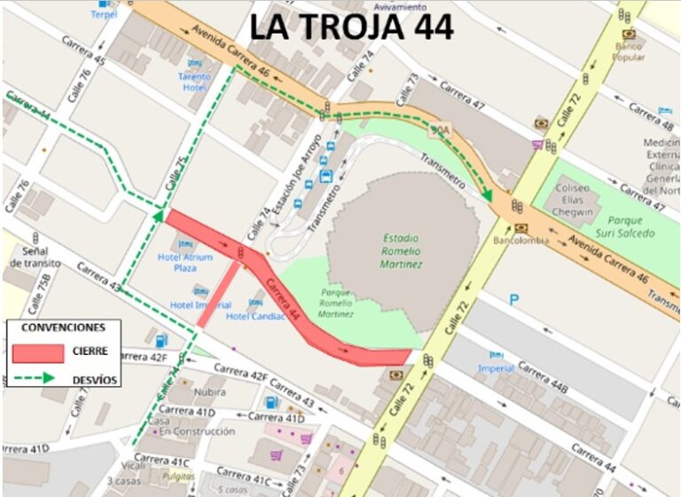 Por evento en el marco del partido entre Colombia y Bolivia, la Secretaría de Tránsito y Seguridad Vial informa a la ciudadanía que la empresa Organización Musical la Troja SAS realizará cierres de vía para este jueves 4 de septiembre de 2025, a partir de las 5:30 p. m y hasta las 11:59 p. m., en la carrera 44 entre calle 72 y 75 y la calle 74 entre carreras 43 y 45.