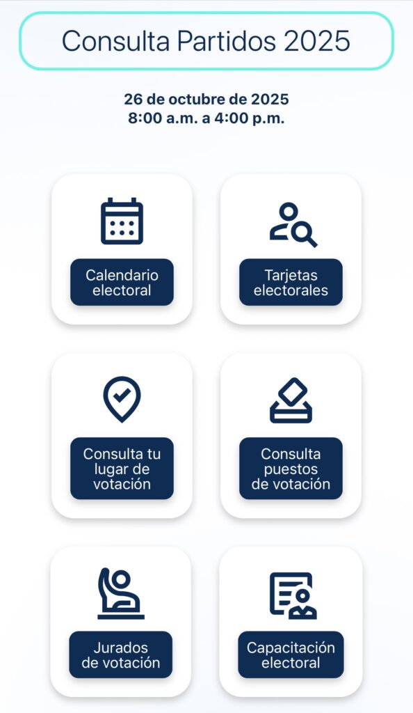 Allí encontrarás seis categorías: Calendario electoral, Tarjetas electorales, Consulta tu lugar de votación, Consulta puestos de votación, Jurados de votación y Capacitación electoral.