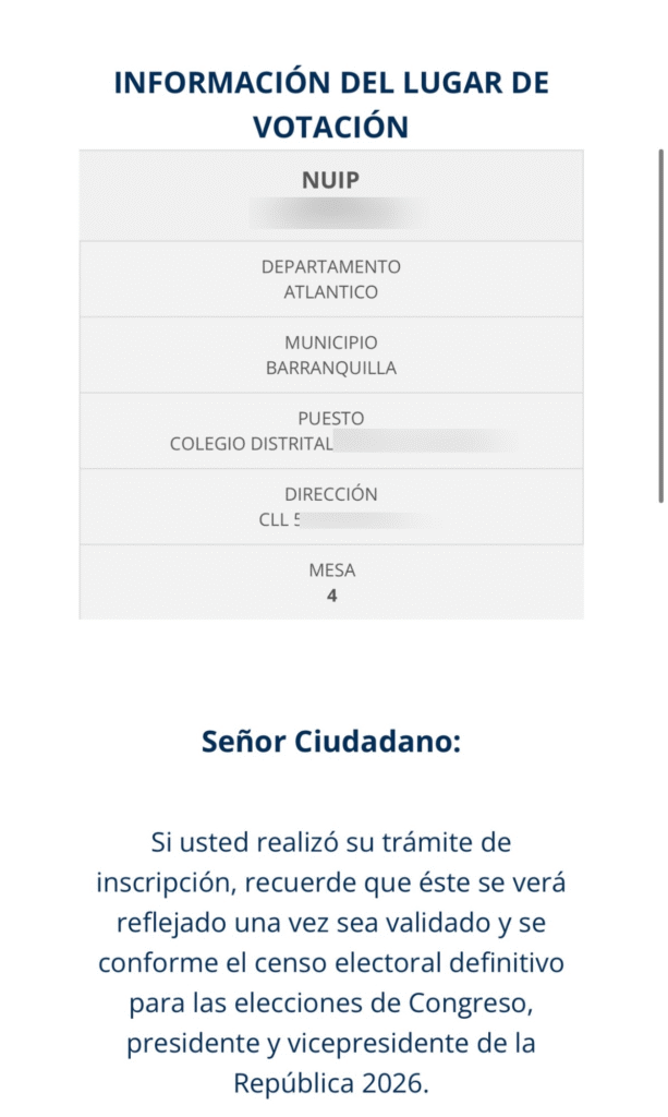 De esta manera, conocerás toda la información que necesitas para ir a votar con cédula en mano: departamento, municipio, puesto, dirección y mesa. Ejemplo: