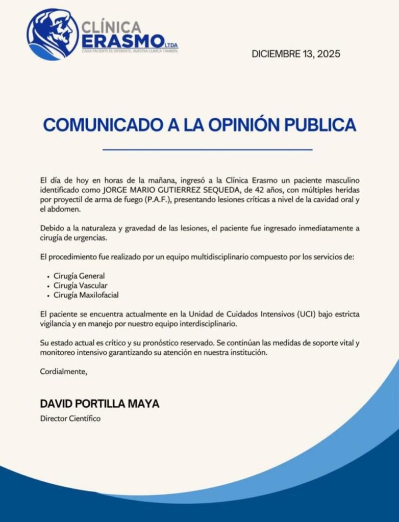 “Debido a la naturaleza y gravedad de las lesiones, el paciente fue ingresado inmediatamente a cirugía de urgencias (…) El paciente se encuentra actualmente en la Unidad de Cuidados Intensivos (UCI) bajo estricta vigilancia y manejo por nuestro equipo interdisciplinario. Su estado actual es crítico y su pronóstico reservado. Se continúan las medidas de soporte vital y monitoreo intensivo garantizando su atención en nuestra institución”, comunicó la Clínica Erasmo.