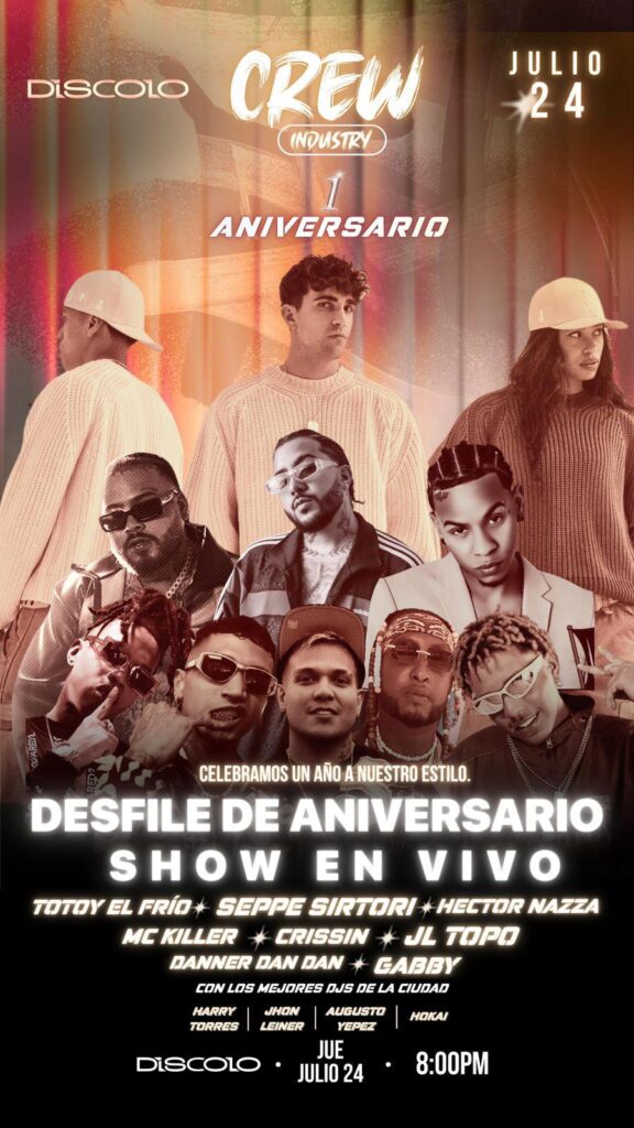 La cita es en Díscolo, a partir de las 8:00 p. m., donde se llevará a cabo un gran desfile de moda con las más recientes colecciones de CREW, acompañado por un show en vivo con artistas de alto calibre como Totoy el Frío, Seppe Sirtori, Hector Nazza, Crissin, MC Killer, JL Topo, Danner Dan Dan y Gaby, entre otros.