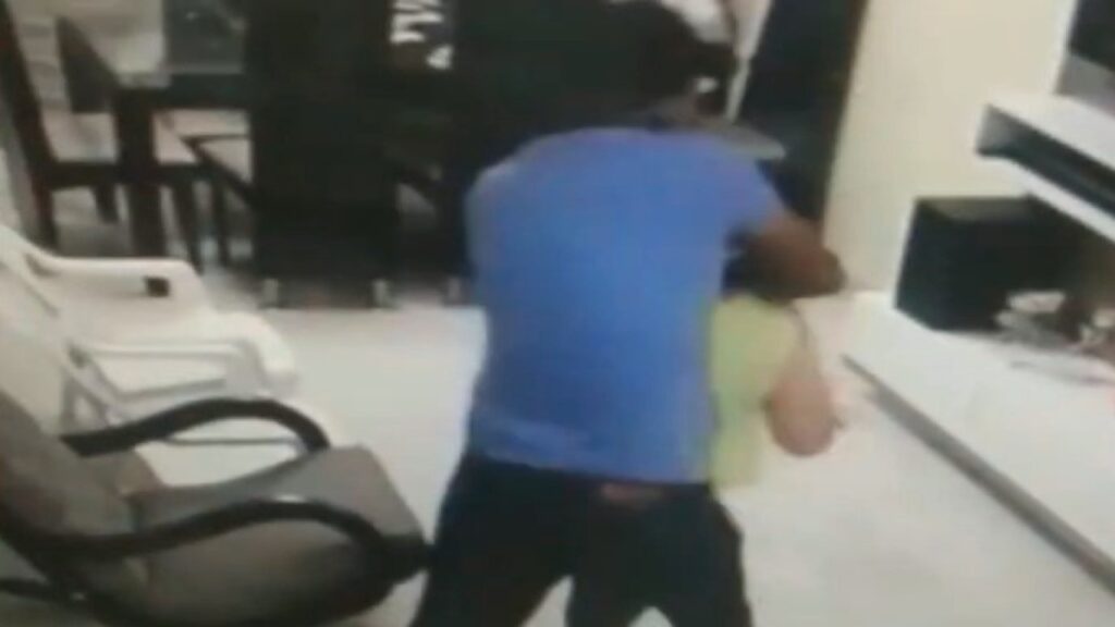 El material audiovisual muestra cuando la propietaria de la casa los atiende y en ese momento uno de los individuos que portaba una camiseta azul con una gorra negra, la intimida y empieza a forcejear con la mujer.
