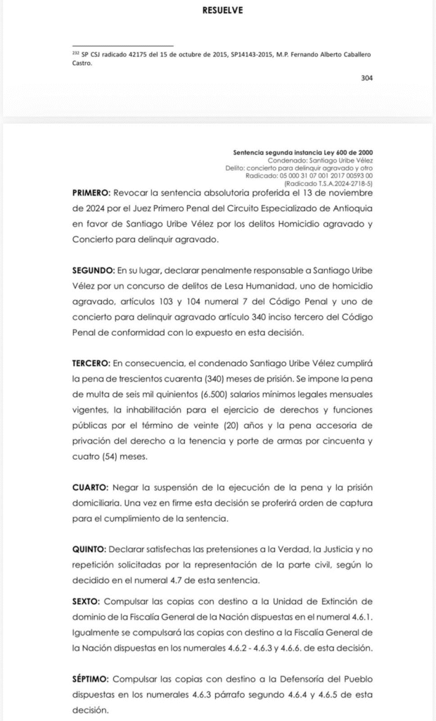Según el fallo del Tribunal, Santiago Uribe Vélez es responsable del homicidio agravado del campesino Camilo Barrientos, asesinado en 1994, y de la creación de esta estructura al margen de la ley, que operaba como un bloque paramilitar para combatir a las guerrillas de izquierda mediante acciones violentas. La sentencia incluye la calificación de los hechos como delitos de lesa humanidad, lo que implica que no prescriben y agrava las penas. El proceso, iniciado en 2010, acumuló 1.368 días de demora solo en la primera instancia, con audiencias que concluyeron en febrero de 2021.