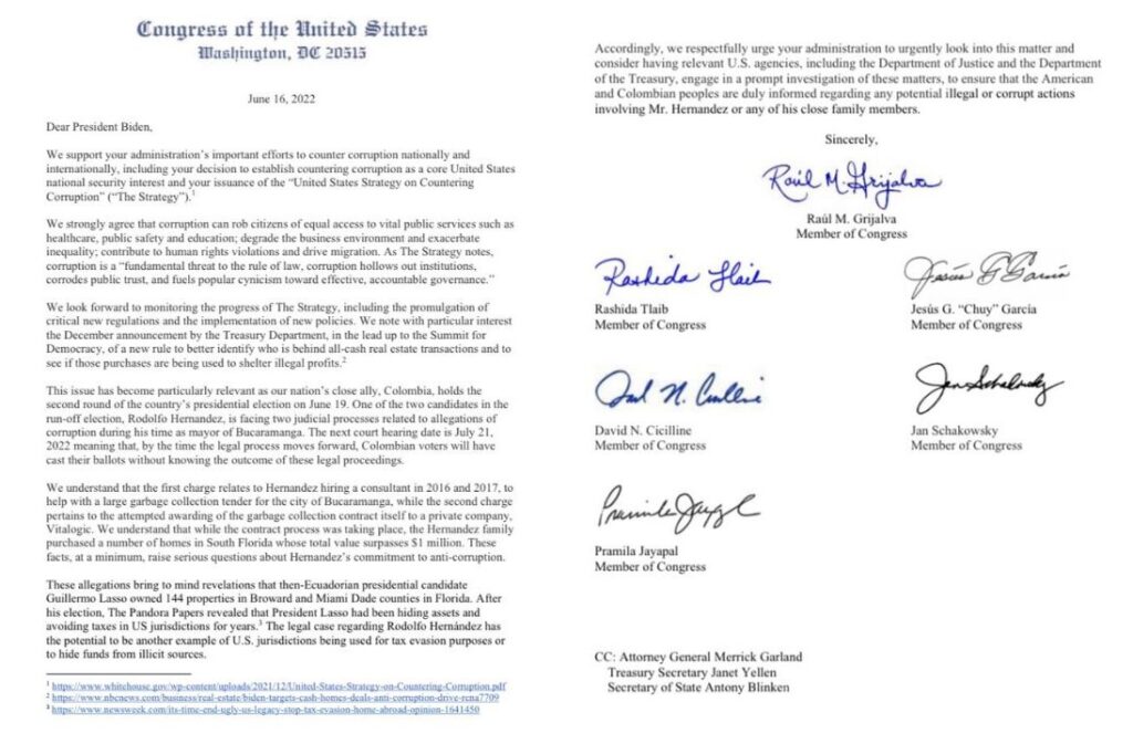 “Le pedimos a su administración que mire de manera urgente estee caso y que agencias como los Departamento de Justicia y del Tesoro, adelanten una investigación sobre estos asuntos para asegurar que la gente de Colombia y EE. UU. estén bien informados sobre cualquier acto ilegal o de corrupción que involucre a Hernández o su familia”, expresó la carta.