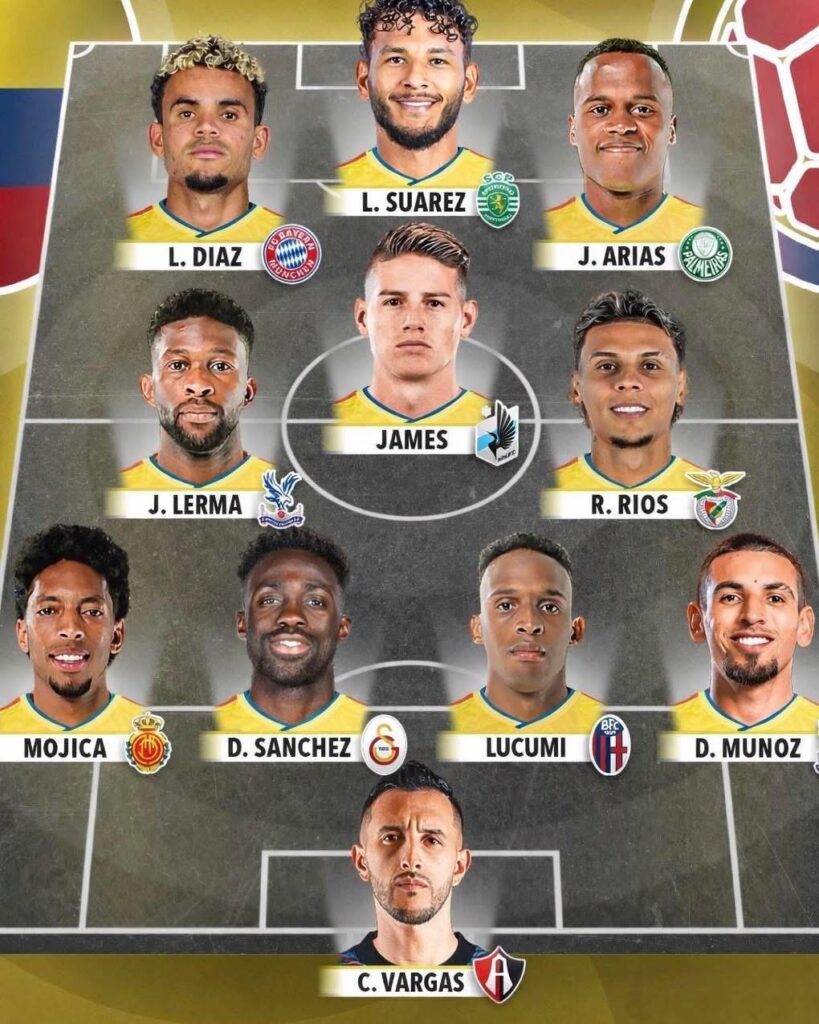 De acuerdo con los citados en esta oportunidad, ese onceno sería: Camilo Vargas bajo los tres postes; Daniel Muñoz, Davinson Sánchez, Jhon Lucumí y Johan Mojica en la zaga; Jefferson Lerma y Richard Ríos en medio de contención; Jhon Arias, James Rodríguez y Luis Díaz en zona ofensiva; y Luis Suárez en la delantera.