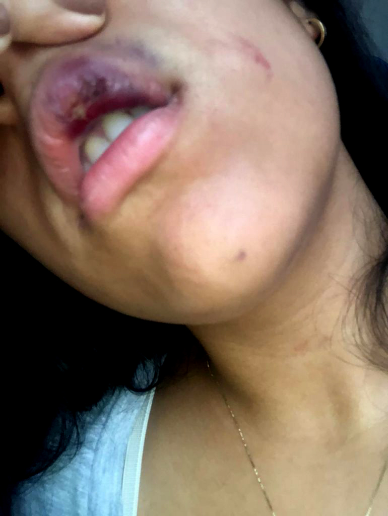 “En medio de su enojo, me lanzó a la cama y comenzó a propinarme brutales golpes en la boca y en el pecho. Los dientes se me aflojaron, se me inflamaran los labios y me quedaran varios moretones en el pecho”, añadió en la denuncia Nahomis Carolina junto a varias fotografías como soporte de la agresión.