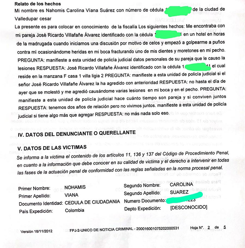 Nahomis Carolina, de 23 años, se encontraba el 31 de octubre de 2020 con Villafañe en un hotel de la ciudad de Valledupar. “Hacía las dos de la madrugada, recibí una llamada al celular por parte de un admirador que estaba en estado de embriaguez. La llamada fue atendida por José Ricardo quien, al escuchar que el hombre me estaba dedicando canciones, puso la conversación en altavoz, originando una acalorada discusión”, expresó la víctima.