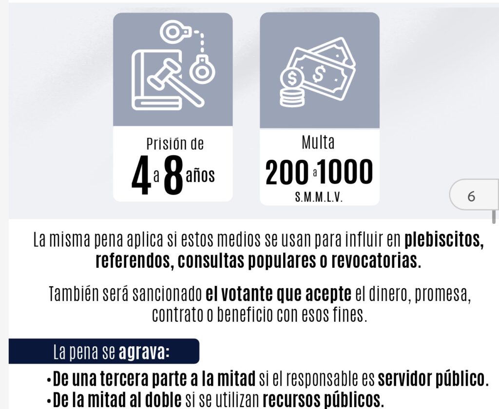 6. Artículo 390. Tipo penal modificado. Ley 1864 de 2017. Corrupción de sufragante: quien ofrezca, prometa, entregue dinero, dádivas, contratos o beneficios para influir en el voto de una persona (a favor de un candidato, partido, voto en blanco o abstención) será sancionado con