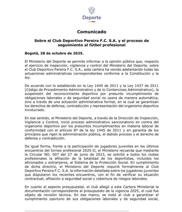 Por otro lado, dicha cartera del Gobierno nacional también se refirió respecto a la decisión de las directivas del conjunto risaraldense de alinear jugadores juveniles para los dos recientes juegos que ha sostenido en la Liga Betplay-II, ello debido a los conflictos que ha tenido con la plantilla profesional, que se halla en paro, recordando el Ministerio que se le solicitó a todos los clubes profesionales la afiliación de la totalidad de los deportistas, incluidos los extranjeros y aficionados, al sistema de protección social.