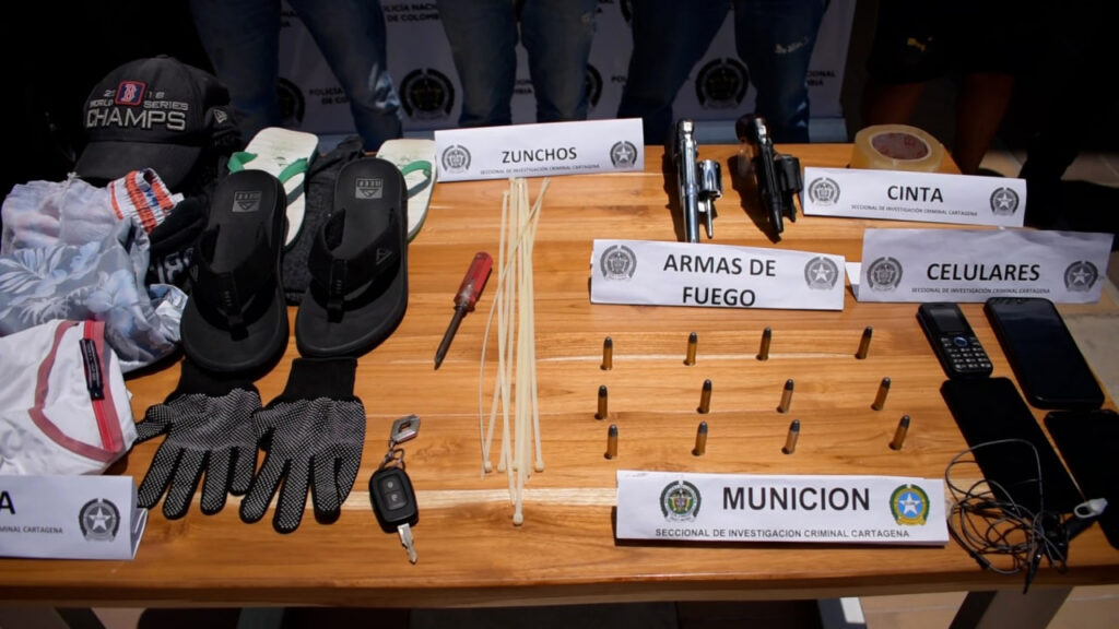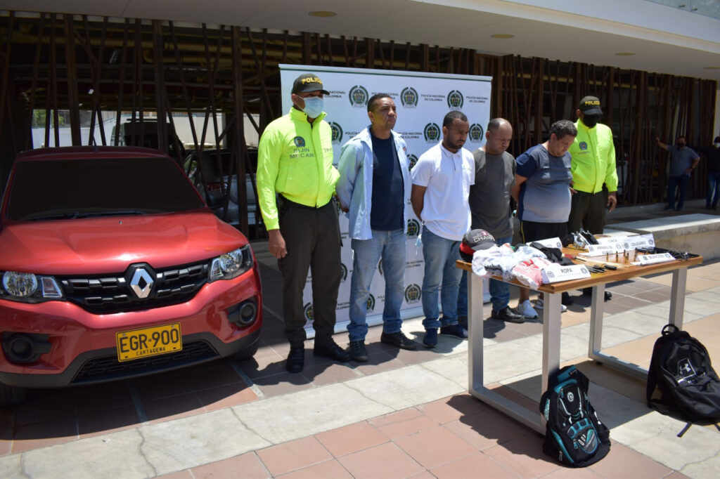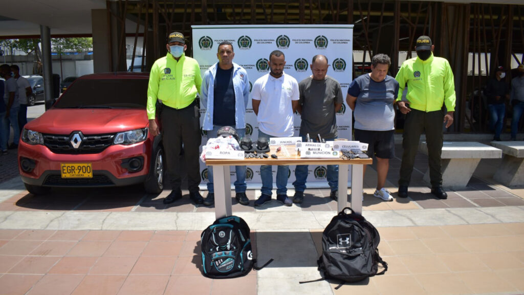 La información obtenida por los policías permitió capturar a cuatro delincuentes a bordo de un automóvil marca Renault, de color rojo, de placas EGR 900, incautando dos revólveres calibre 38mm, con 12 cartuchos, 4 celulares, 15 sunchos plásticos, cinta adhesiva y 17 prendas de vestir, entre pantalonetas, chancletas, suéteres deportivos, para escapar disfrazados como turistas, cuando se disponían a ejecutar un hurto en un establecimiento comercial ubicado en el mercado de Bazurto.