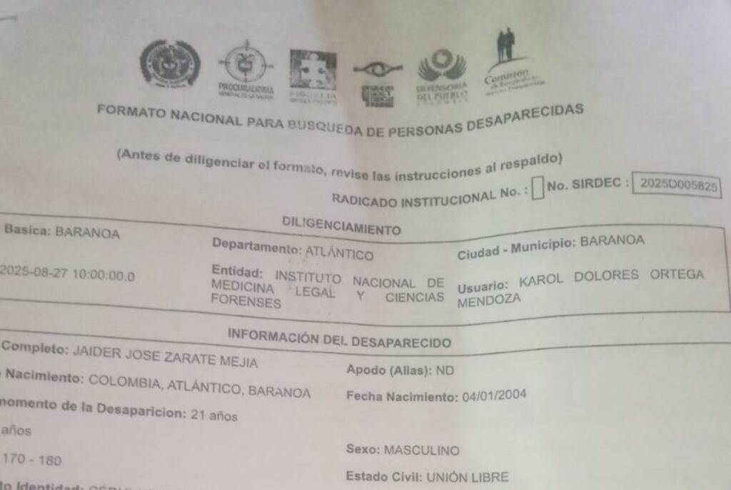 Desde hace dos días se encuentra desaparecido Jaider José Zárate Mejía, de 21 años de edad, quien salió de su vivienda rumbo a la casa de un amigo y nunca regresó. Hechos registrados en el barrio El Pradito de Baranoa, Atlántico.