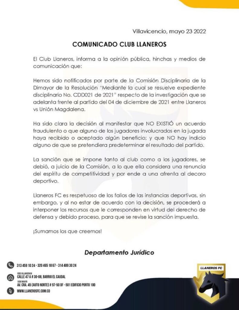 Minutos después de hacerse público el oficio de Dimayor, las directivas del conjunto de Villavicencio respondieron a la Comisión Disciplinaria que “no fallaron al espíritu de competitividad ni afrenta al decoro deportivo”.