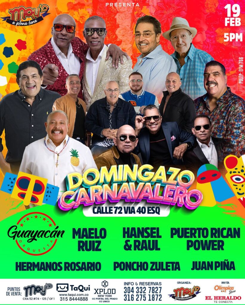 Una nómina de lujo conforma el Domingazo Carnavalero, desde las 5:00 de la tarde, con invitados como Los Hermanos Rosario, Hansel y Raúl, Guayacán Orquesta, Maelo Ruiz, Puerto Rican Power, Poncho Zuleta y Juan Piña.