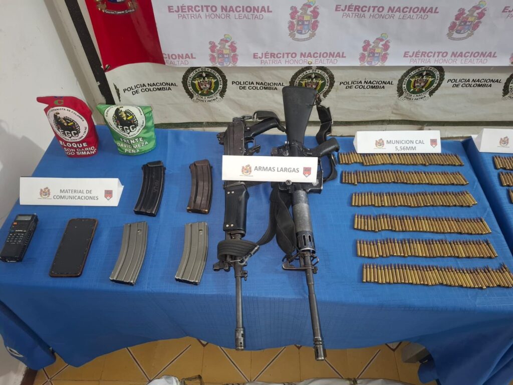 En el lugar de los hechos se incautaron 2 fusiles, 358 cartuchos calibre 5,56 mm, proveedores, 2 brazaletes alusivos al Ejército Gaitanista de Colombia y material de comunicaciones e intendencia.