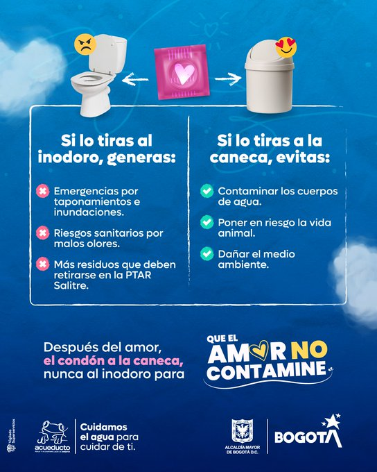 En el marco de la celebración de Amor y Amistad, la Empresa de Acueducto y Alcantarillado de Bogotá (EAAB) reactivó su campaña “Que el amor no contamine”, una estrategia de educación ciudadana que busca prevenir daños al sistema de alcantarillado por el mal manejo de residuos sólidos, especialmente productos de un solo uso como preservativos, toallas higiénicas, tampones y toallitas húmedas.