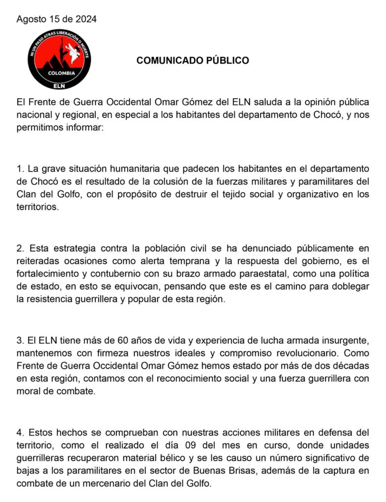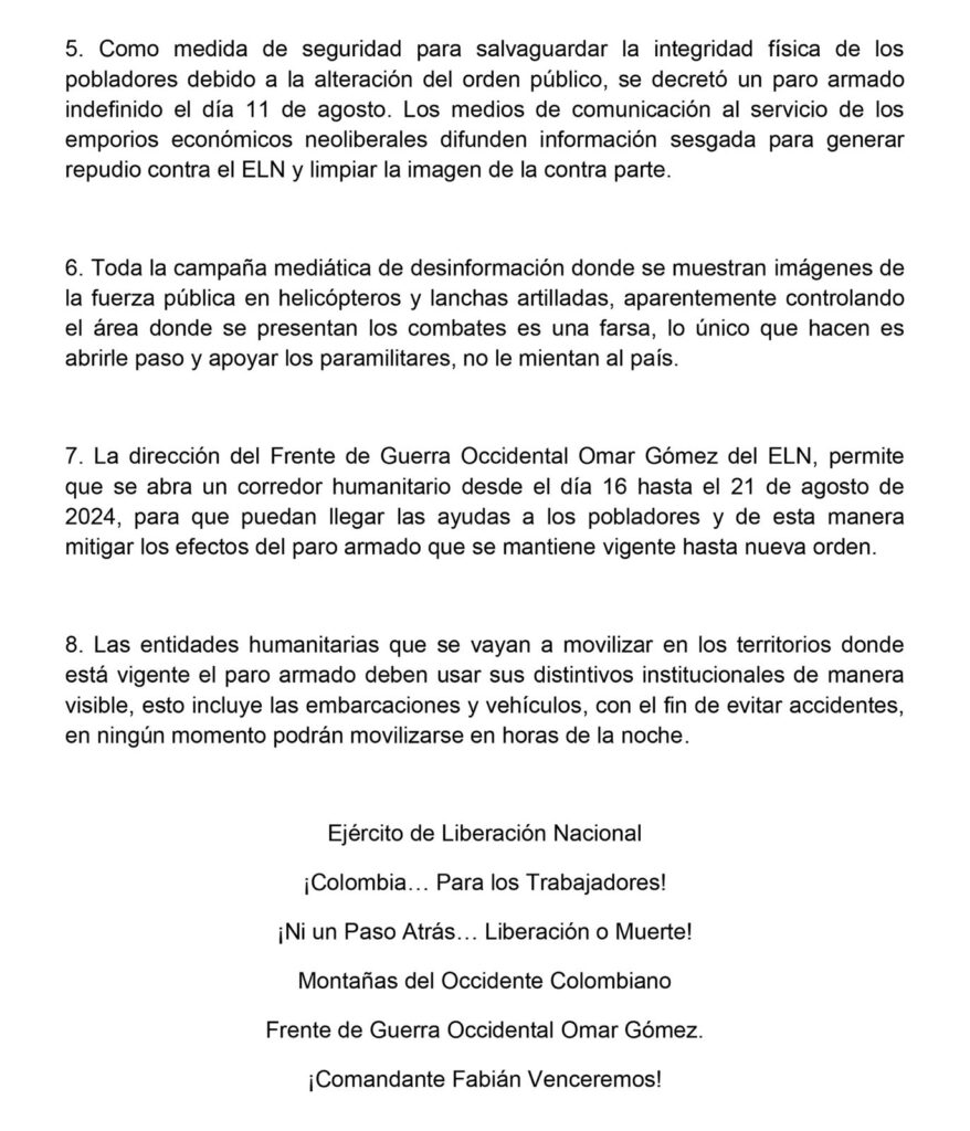 “La dirección del Frente de Guerra Occidental Omar Gómez del ELN, permite que se abra un corredor humanitario desde el día 16 hasta el 21 de agosto de 2024, para que puedan llegar las ayudas a los pobladores y de esta manera mitigar los efectos del paro armado que se mantiene vigente hasta nueva orden”, se lee en un comunicado del grupo armado.