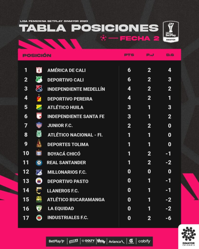 Como primeras y segundas en el torneo están las actuales campeonas y subcampeonas: América de Cali y Deportivo Cali, ambas con seis puntos en dos jornadas disputadas.
