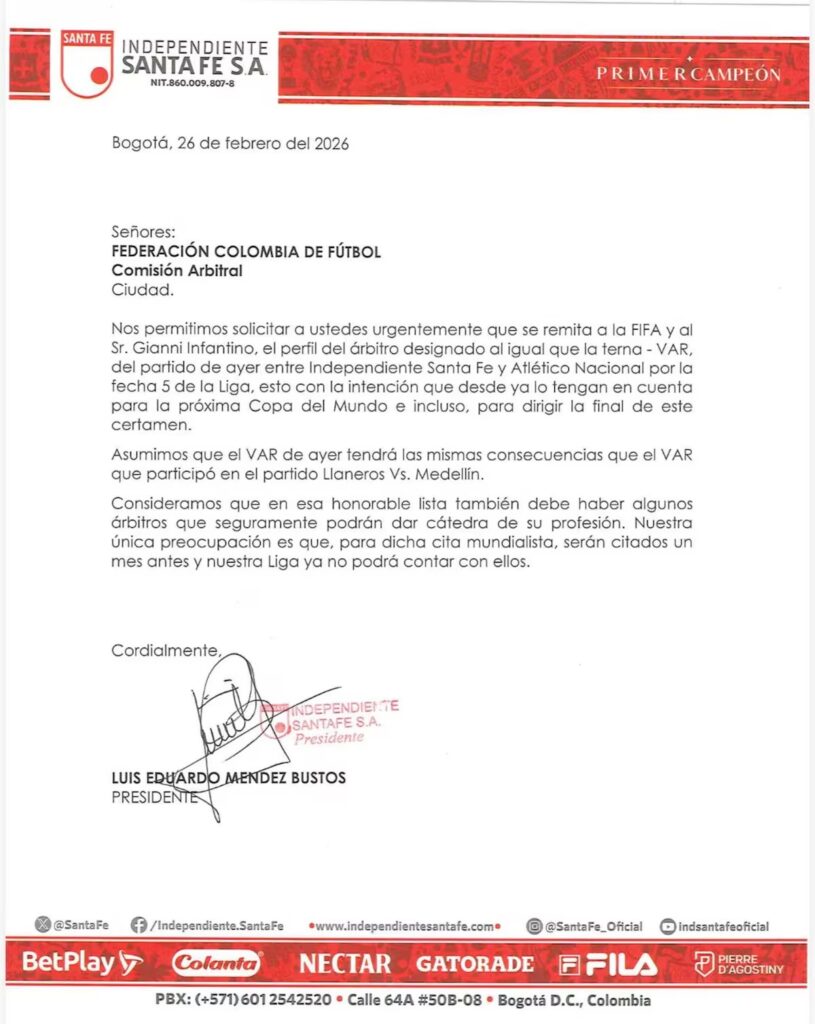 “Nos permitimos solicitar a ustedes urgentemente que se remita a la FIFA y al Sr. Gianni Infantino, el perfil del árbitro designado, al igual que la terna VAR, del partido de ayer entre Independiente Santa Fe y Atlético Nacional por la fecha 5 de la Liga, esto con la intención de que desde ya lo tengan en cuenta para la próxima Copa del Mundo e incluso para dirigir la final de este certamen”, se lee en el sarcástico comunicado.