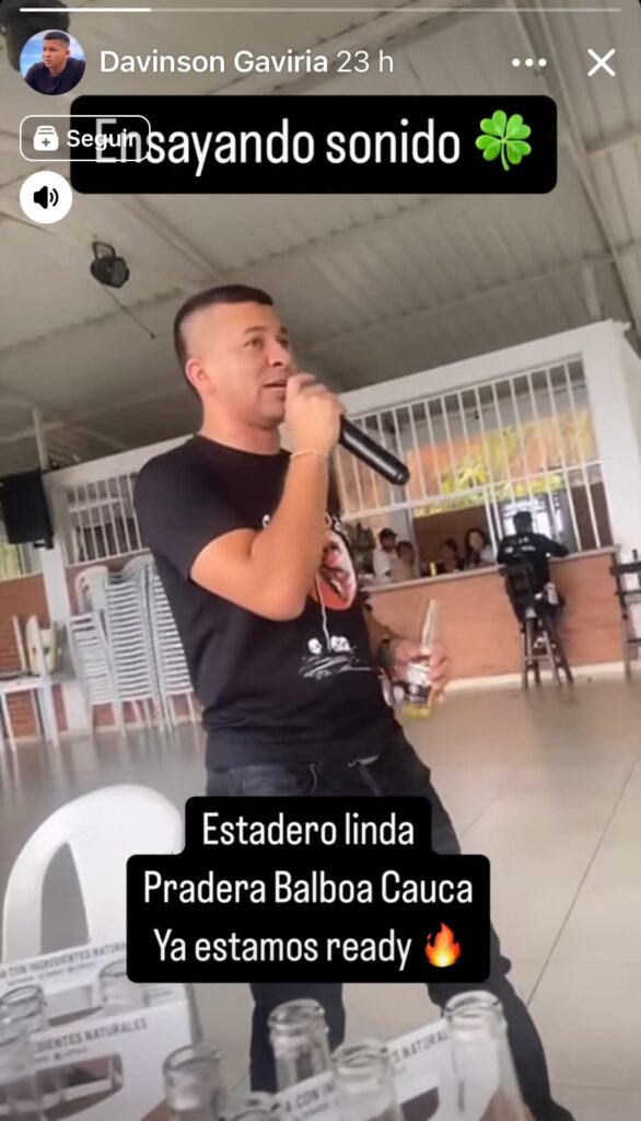 Poco antes de la presentación, Davinson compartió una historia en su cuenta de Facebook, en la que escribió: “Ensayando sonido. Estadero Linda Pradera, Balboa, Cauca. Ya estamos ready”.