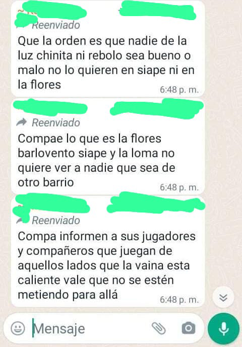 “La orden es que nadie de La Luz, La Chinita o Rebolo, sea bueno o malo, esté en Siape o en Las Flores”. Compae, lo que es Barlovento, Siape y La Loma, no quieren ver a nadie que sea de otro barrio. Informen a sus jugadores y compañeros de aquellos lados que la vaina está caliente, que no se metan por allá”.