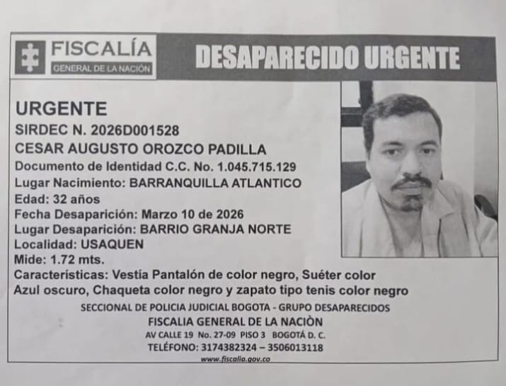 La angustia consume a los familiares de César Augusto Orozco Padilla, barranquillero de 32 años de edad que fue reportado como desaparecido en la localidad de Usaquén, en Bogotá, desde el pasado 10 de marzo.