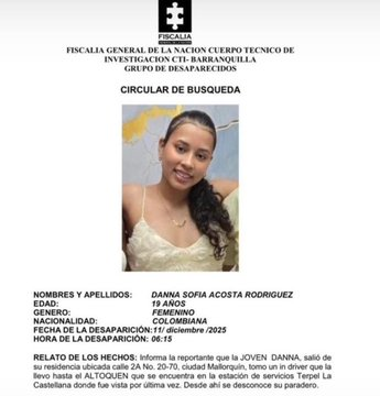 La desaparición de Danna Sofía ocurrió el jueves 11 de diciembre alrededor de las 6:10 de la mañana, cuando salió de su residencia en el conjunto Altamar Caribe, en el sector de Ciudad Mallorquín, jurisdicción de Puerto Colombia, con destino a la universidad para presentar un examen parcial.
